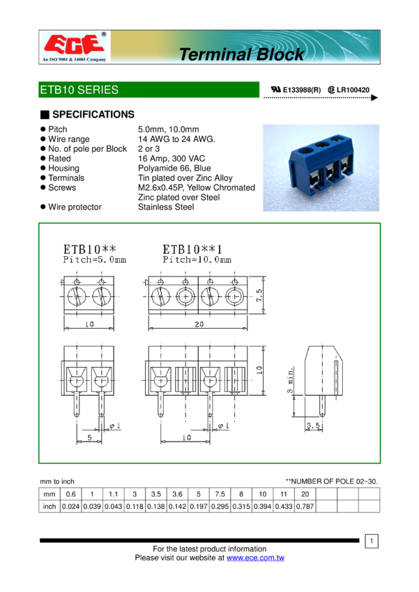 Łączówka; ETB10-03; AK301; 3 tory; R=5mm; 10mm; 15A; 300V; THT; proste; śrubowy; poziomy; 1,5mm;2; czarny; ULO; RoHS