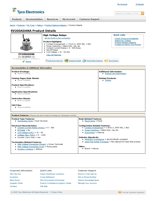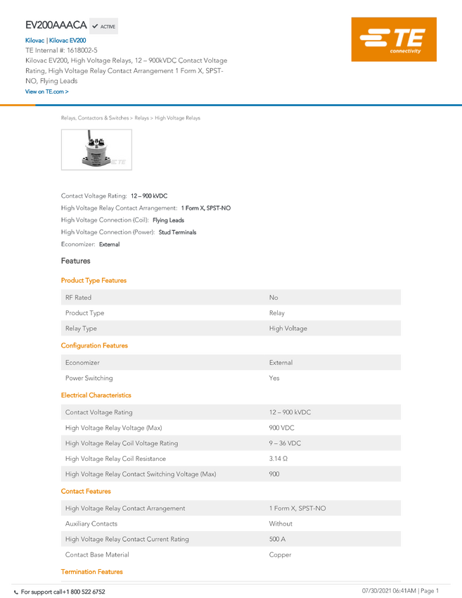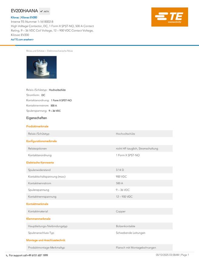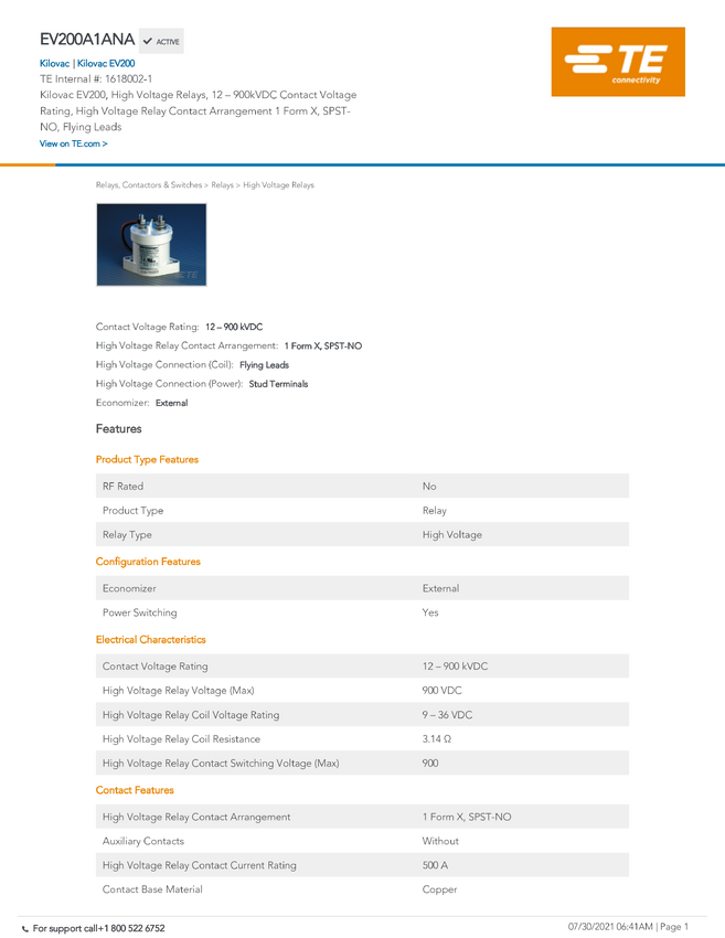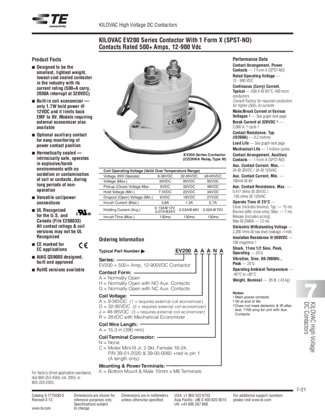 Przekaźnik przemysłowy TE Connectivity EV200HAANA 36 V/DC 1 NO 1 szt.