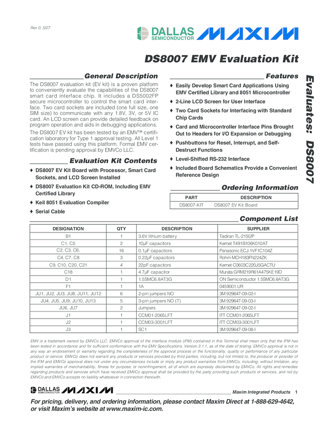 DS8007-KIT Evaluation Kit for DS8007 Multiprotocol Dual Smart Card Interface