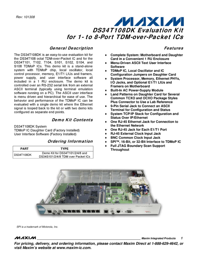 DS34T108DK Evaluation Kit for the DS34T101, DS34T102, DS34T104, DS34T108, DS34S101, DS34S102, DS34S104, and DS34S108
