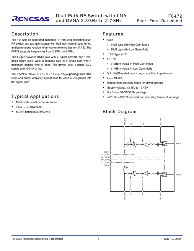 Evaluation Board for F0472B Dual Path RF Switch with LNA and DVGA