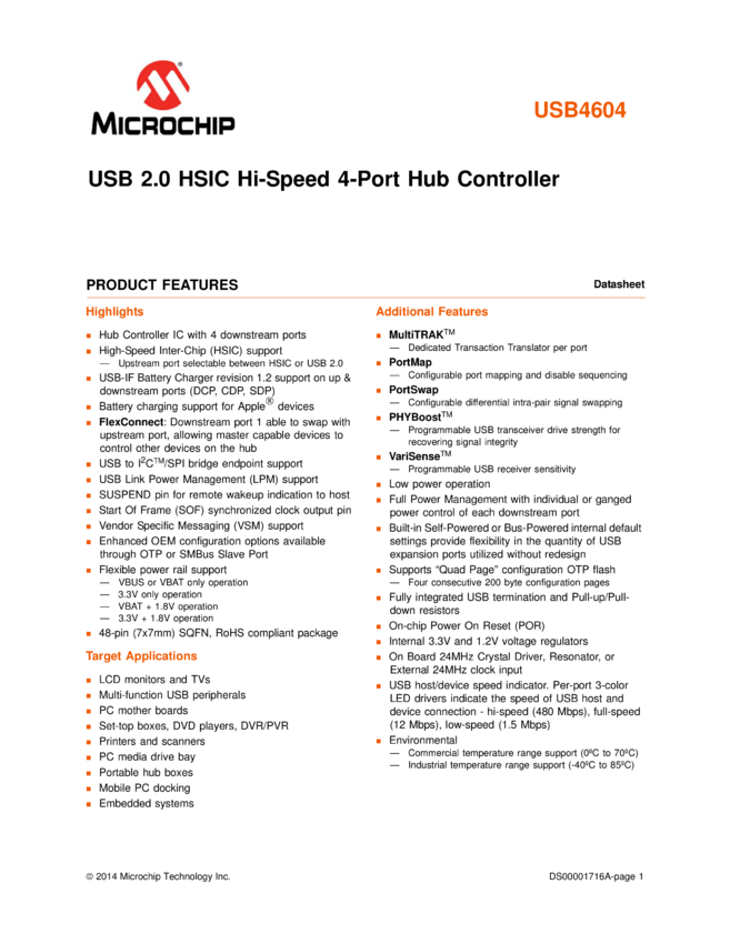 USB4604 USB 2.0 HSIC Hi-Speed 4-Port Hub Controller (05/06/2014)