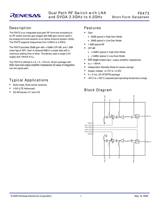 Evaluation Board for F0473B Dual Path RF Switch with LNA and DVGA