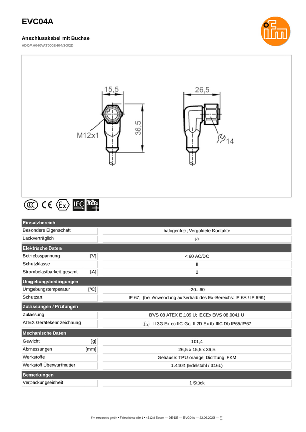 ifm Electronic EVC046 Linia połączenia złącze męskie proste, złącze żeńskie kątowe 0.6 m Ilość pinów: 3, 5 1 szt.