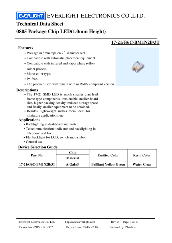 Dioda LED SMD Everlight Opto 15-21UYC/S530-A2/3T 39 mcd 130 ° 25 mA 2.4 V 1 szt.