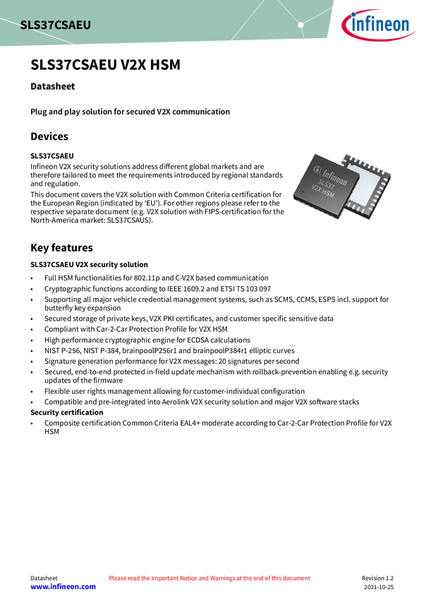 Plug & play solution for secured V2X communication Infineon’s SLS37 V2X HSM safeguards automotive V2X (Vehicle to Everything) communication based on a tamper-resistant security controller tailored to the security needs in V2X applications within telematics control units, protecting critical assets such as the integrity and moreover authenticity of messages, as well as the privacy of the sender. This plug & play security solution offers a host of benefits to automotive OEMs, tier-1 suppliers, and so