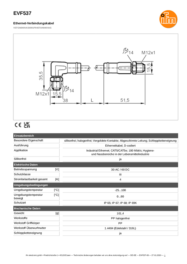 ifm Electronic EVF537 Linia połączenia EVF537, piny: 4, 1 m, 1 szt.