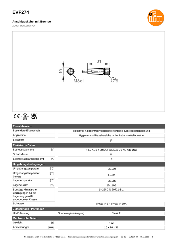 ifm Electronic EVF002 Kabel połączeniowy EVF002, piny: 5, 10 m, 1 szt.