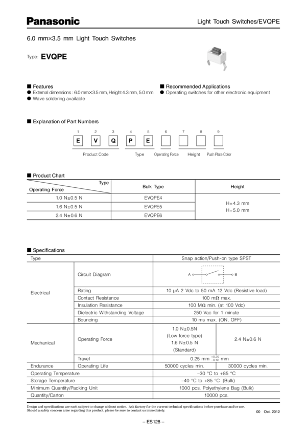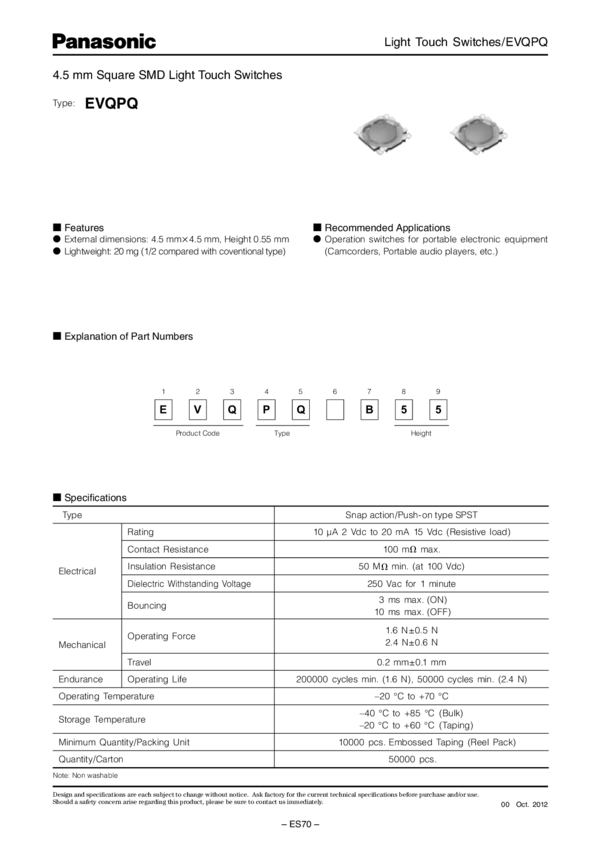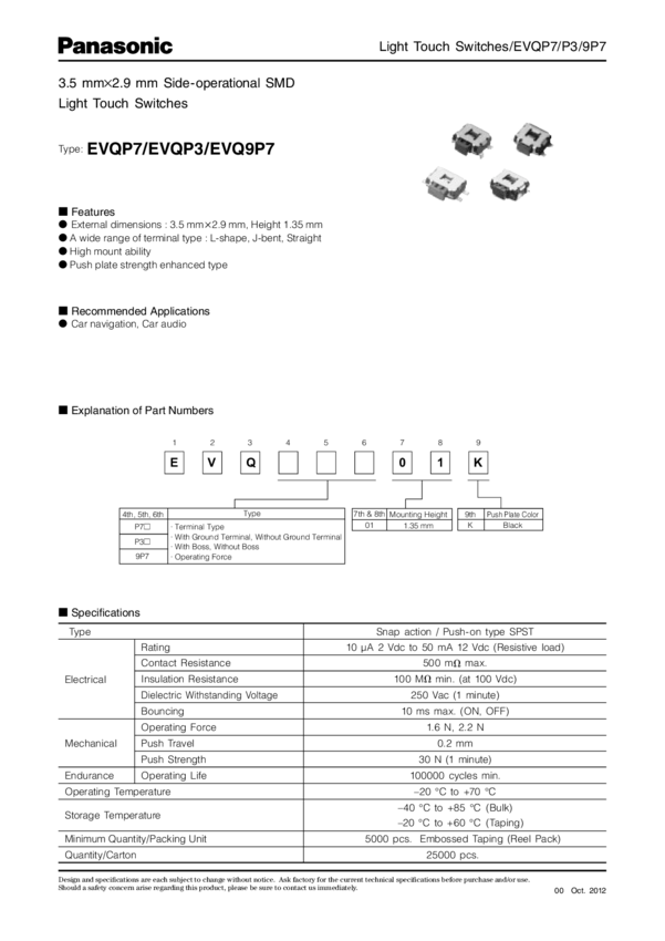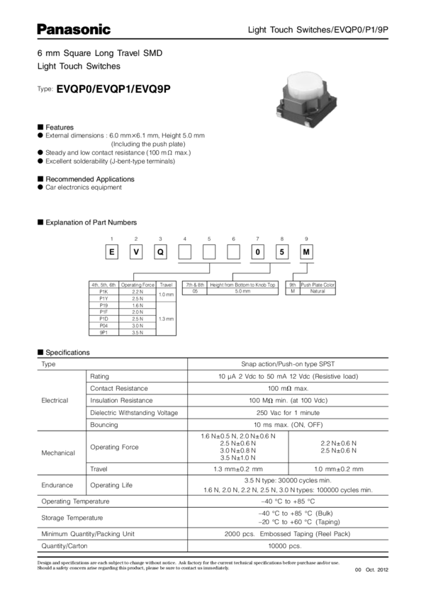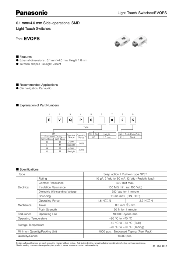 Switch Tactile N.O. SPST Button J-Bend 0.05A 12VDC 1.6N SMD Embossed T/R