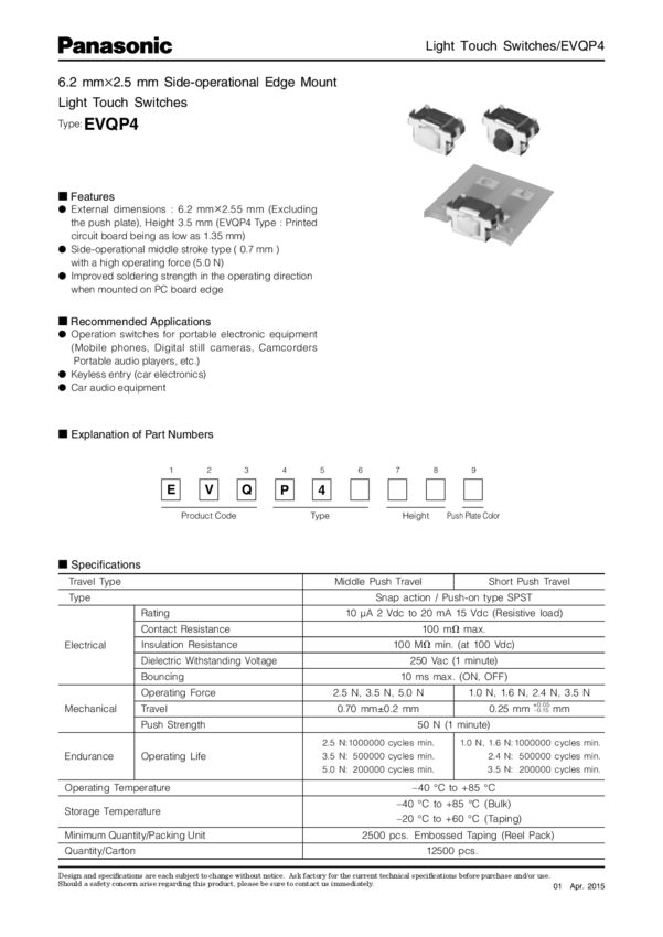 Switch Tactile N.O. SPST Rectangular Button J-Bend 0.02A 15VDC 5N SMD Embossed Tape and Reel
