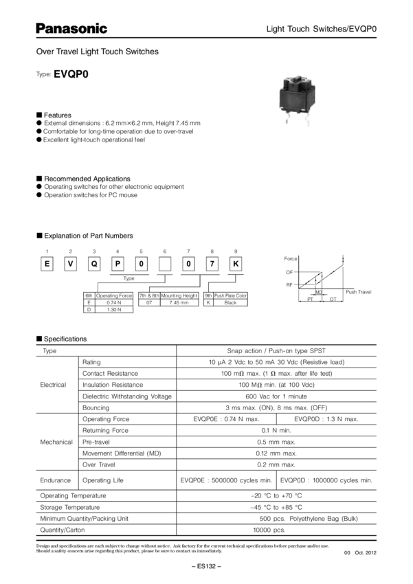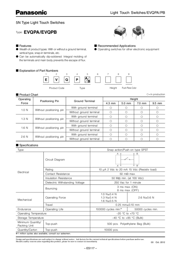 Switch Tactile N.O. SPST Button PC Pins 0.05A 30VDC 0.74N Thru-Hole Bulk