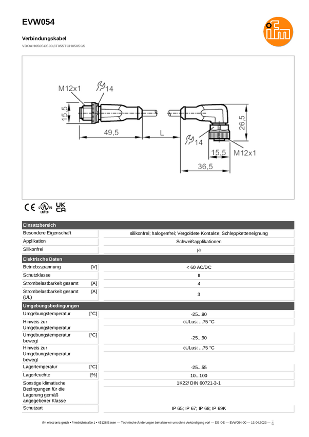 ifm Electronic EVW054 Linia połączenia złącze męskie proste, złącze żeńskie kątowe 0.3 m Ilość pinów: 5, 5 1 szt.