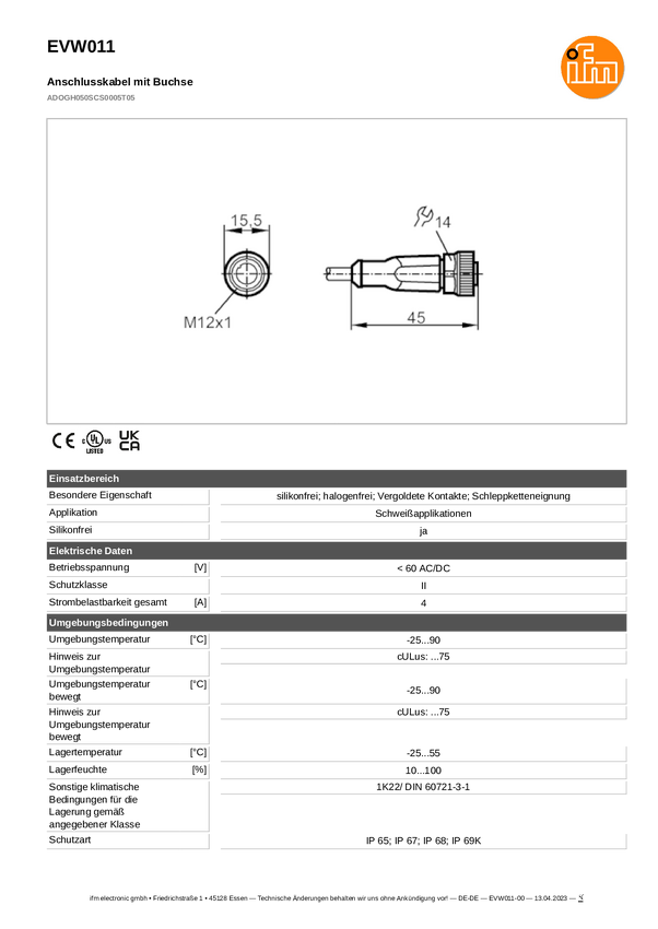 ifm Electronic EVW024 Linia połączenia złącze męskie proste, złącze żeńskie proste 1 m Ilość pinów: 4, 5 1 szt.