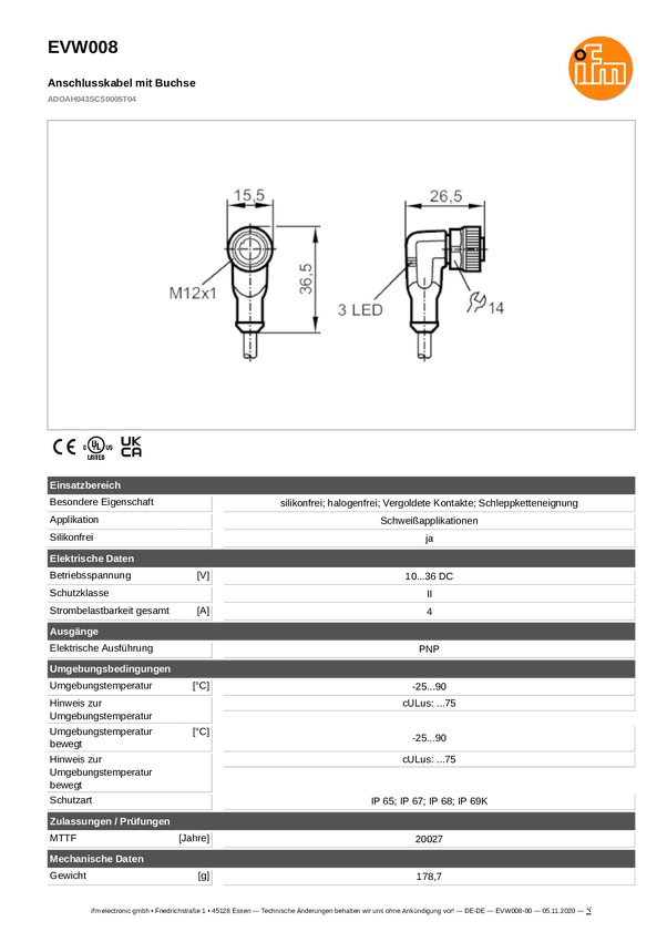 ifm Electronic EVW071 Kabel połączeniowy EVW071, piny: 3, 5 m, 1 szt.