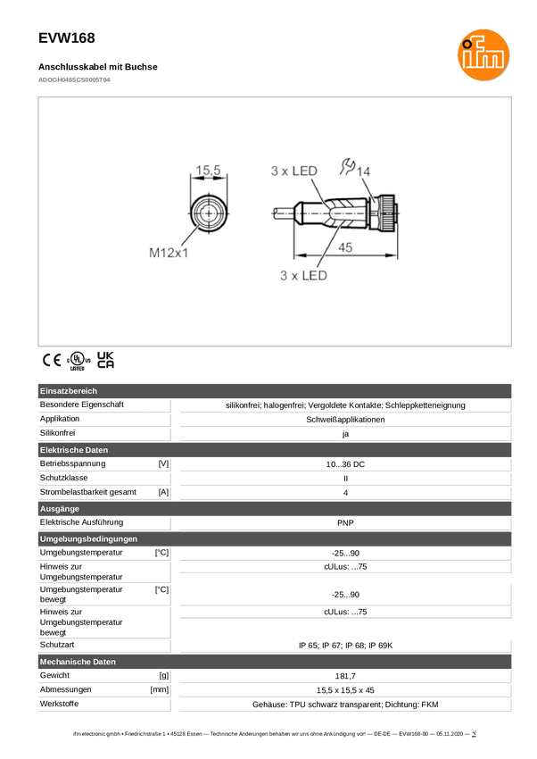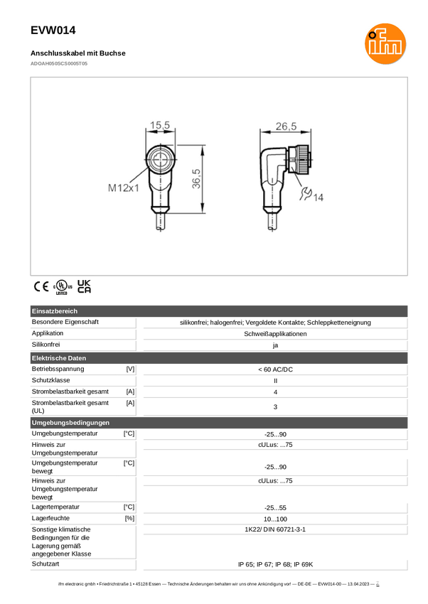 ifm Electronic EVW031 Linia połączenia złącze męskie proste, złącze żeńskie kątowe 2 m Ilość pinów: 4, 5 1 szt.