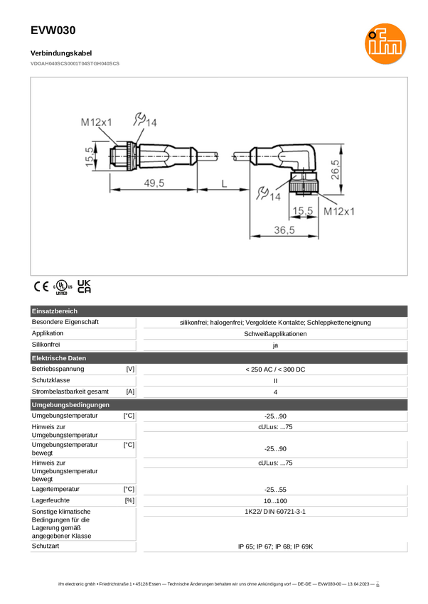 ifm Electronic EVW030 Linia połączenia złącze męskie proste, złącze żeńskie kątowe 1 m Ilość pinów: 4, 5 1 szt.