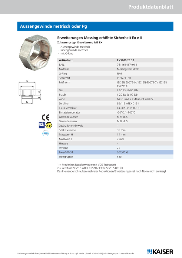 Kaiser Elektro EX3600.25.32 Złącze dławnicy kablowej M25 M32 mosiądz (niklowany) 1 szt.
