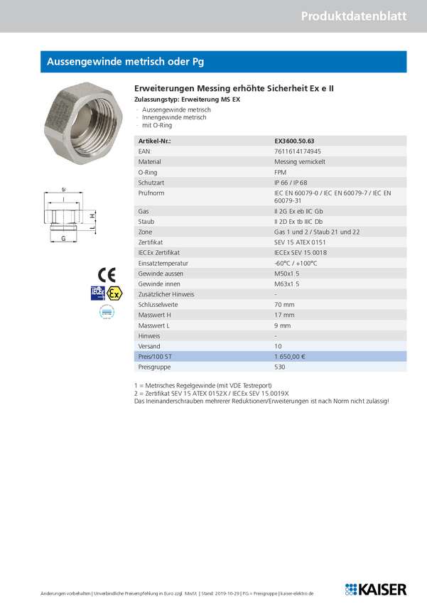 Kaiser Elektro EX3600.50.63 Złącze dławnicy kablowej M50 M63 mosiądz (niklowany) 1 szt.