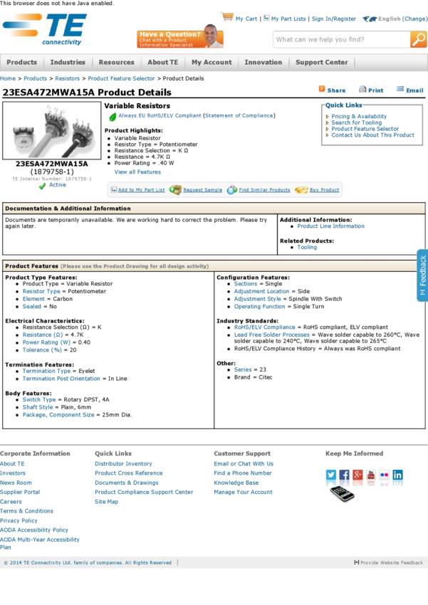 Res Carbon Film POT 4.7K Ohm 20% 2/5W 1(Elec)/1(Mech)Turn 6mm (30.7 X 20.4 X 25.2mm) Eyelet Panel Mount