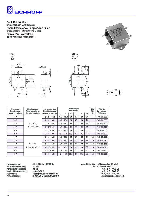 Eichhoff F033-016/500 Filtr szumów F033-016/500, 110 V/AC, 250 V/AC, 16 A, 1 mH