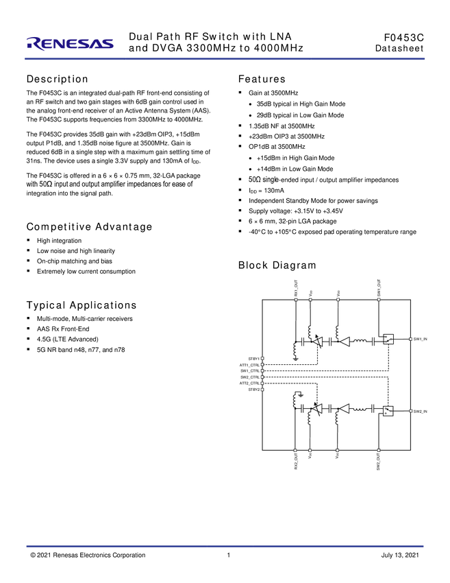 Evaluation Board for F0473B Dual Path RF Switch with LNA and DVGA