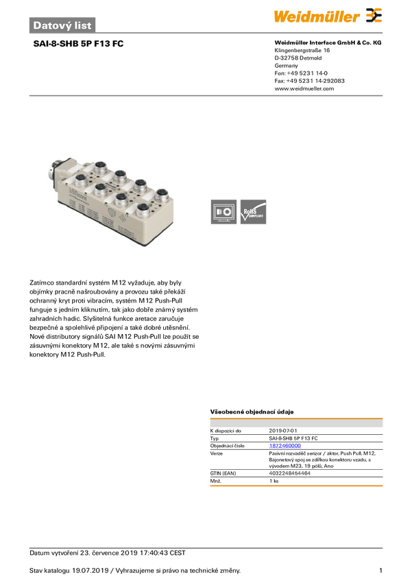 Rozdzielacz czujnik / element wykonawczy, pasywny Weidmüller SAI-8-SHB 5P F13 FC 1872460000 1 szt.