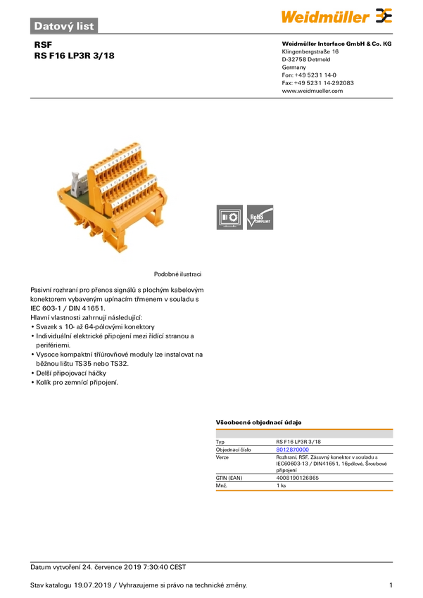 Moduł transferowy Weidmüller RS F16 LP3R 3/18 8012870000, 1 szt.