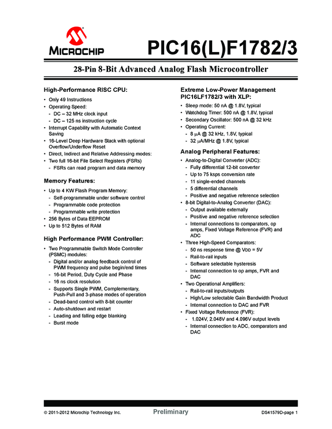 PIC16(L)F1782/3 28-Pin 8-Bit Advanced Analog Flash MCUs (11/12/2012)