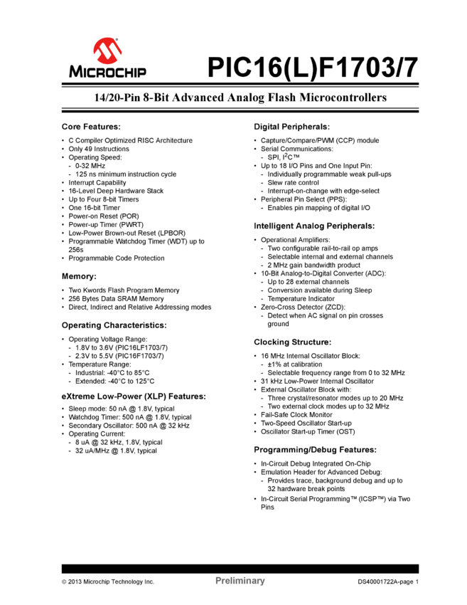 PIC16(L)F1703/7 14/20-Pin 8-Bit Advanced Analog Flash MCU (10/03/2013)