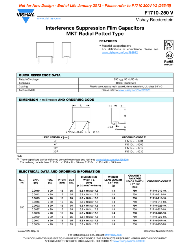 Cap Film 0.01uF 250VAC PET 20% (17.8 X 6.3 X 12.3mm) Radial 15mm T/R