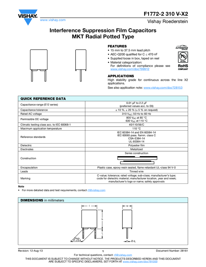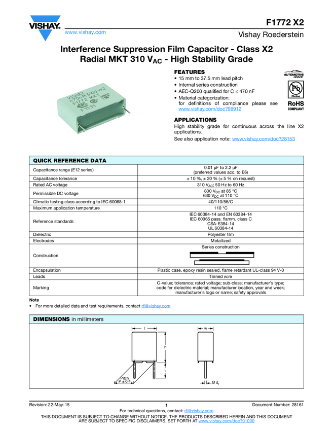 Interference Suppression Film Capacitor - Class X2 Radial MKT 310 VAC - High Stability Grade
