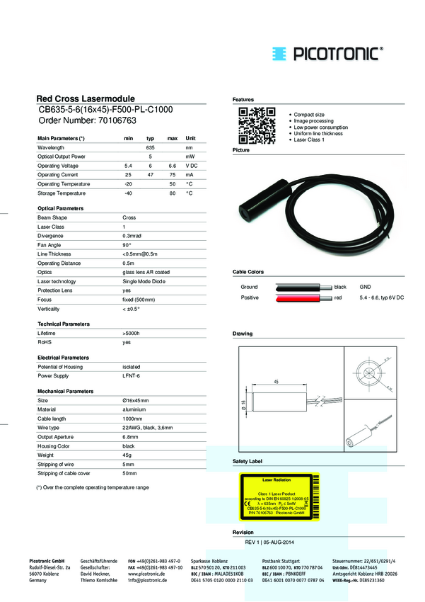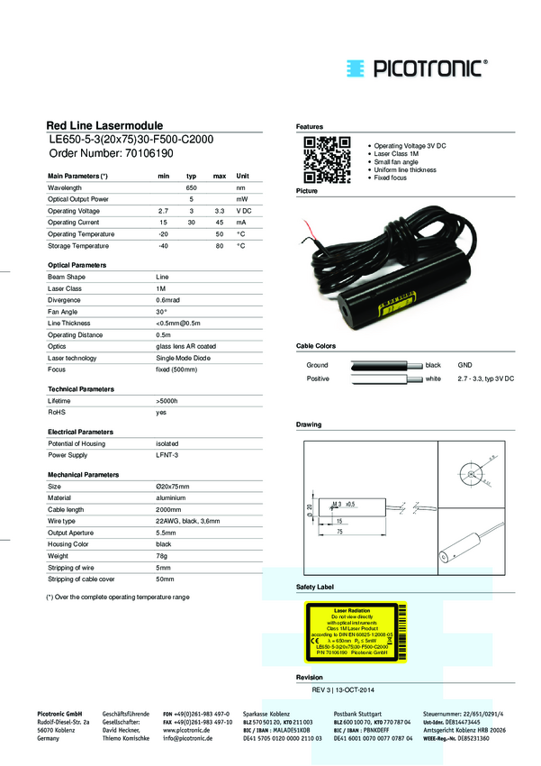 Picotronic 70106190 Moduł laserowy LE650-5-3(20x75)30-F500-C2000, klasa 1M, 5 mW, 650 nm
