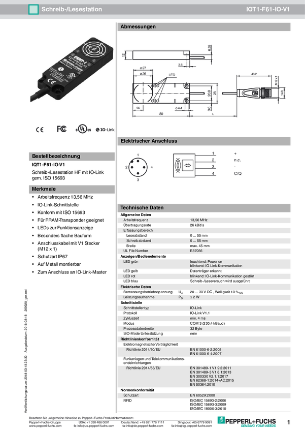 Pepperl+Fuchs 299928 Głowica odczytu/zapisu RFID IQT1-F61-IO-V1 1 szt.