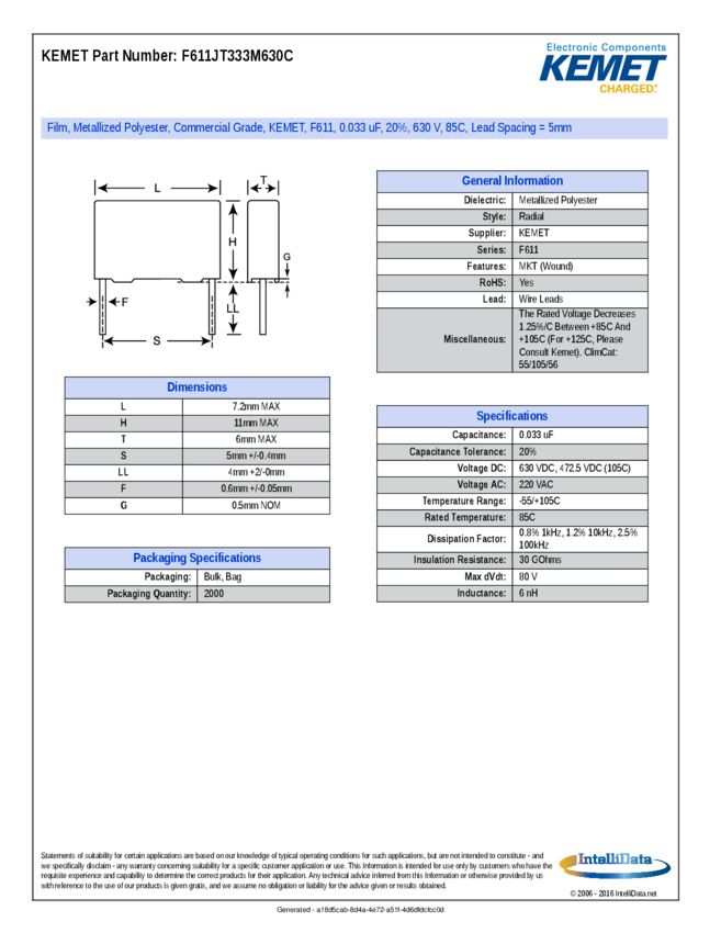 Cap Film 0.033uF 630V PET 20% (7.2 X 6 X 11mm) Radial 5mm 105°C Bulk