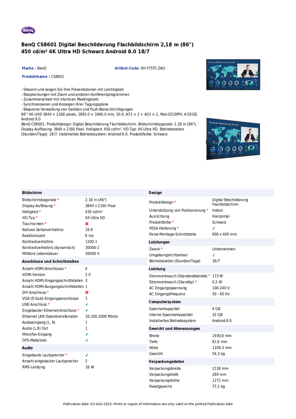 Wyświetlacz wielkoformatowy BenQ CS8601 9H.F75TC.DA2, 1 szt.