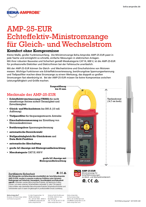 Miernik cęgowy cyfrowy Beha Amprobe Fluke AMP-25 KIT 5340786, CAT III 600 V, kalibracja fabryczna (bez certyfikatu)