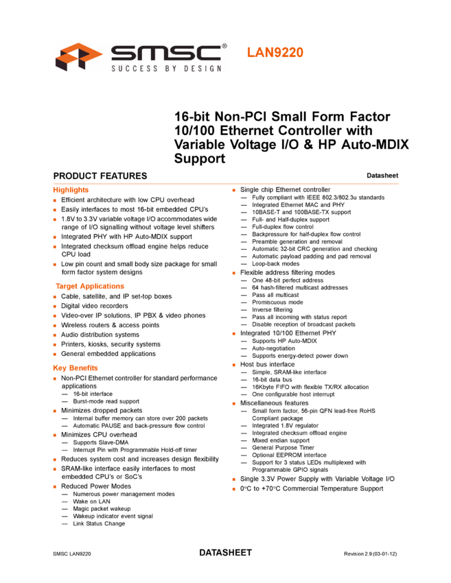 LAN9220 16-bit Non-PCI Small Form Factor 10/100 Ethernet Controller with Variab (03/01/2012)
