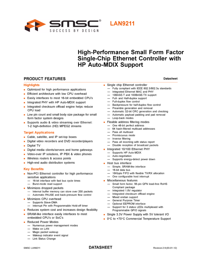LAN9211 High-Performance Small Form Factor Single-Chip Ethernet Controller with (03/01/2012)