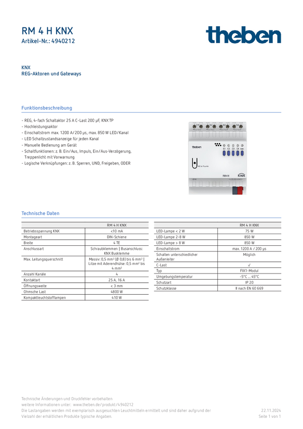 Element wykonawczy Theben 4940212 RM 4 H KNX (4-fach Schaltaktor 25A FIX1)