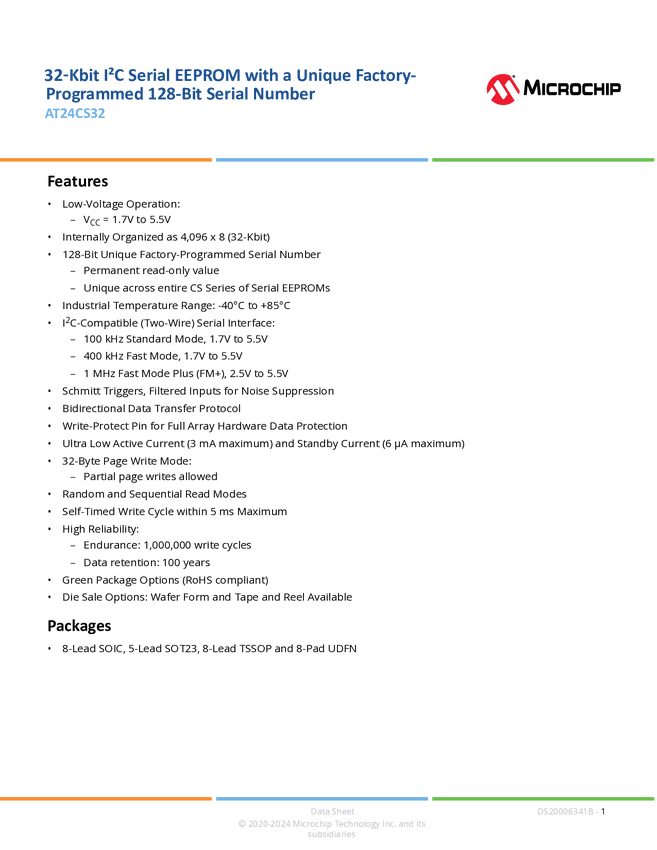 AT24CS32 - 32‑Kbit I²C Serial EEPROM with a Unique Factory-Programmed 128-Bit Serial Number