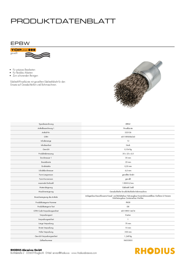 RHODIUS EPBW, 12 sztuk szczotka końcowa 30 x 25 x 6,0 mm, falista, TOPline, do stali nierdzewnej, stali Rhodius 353156