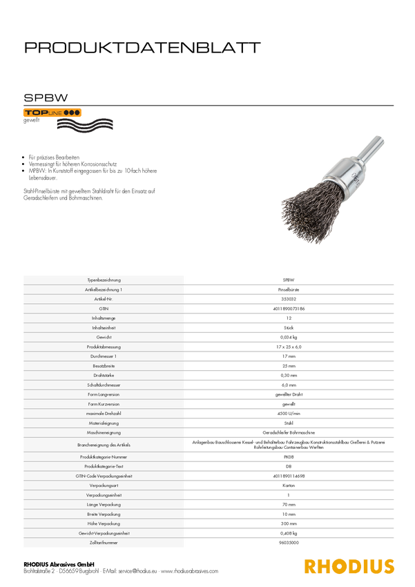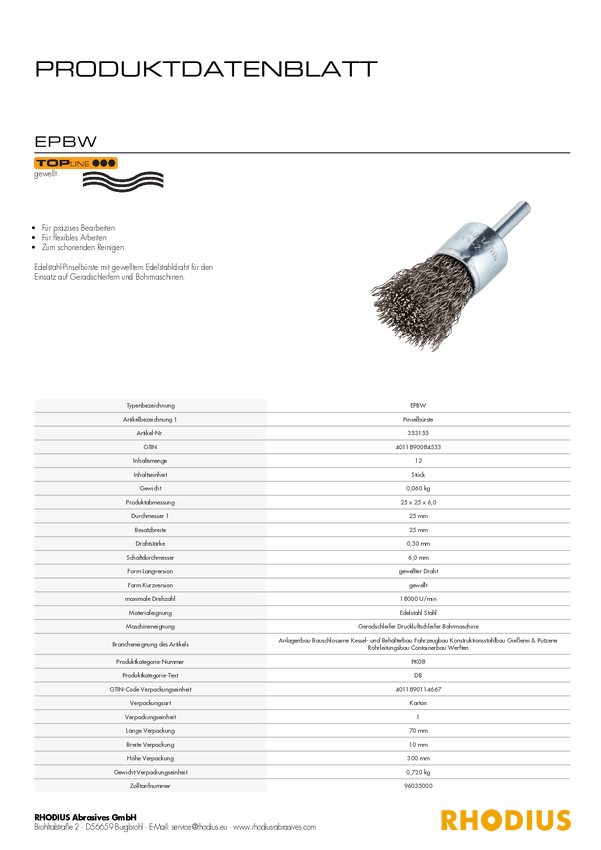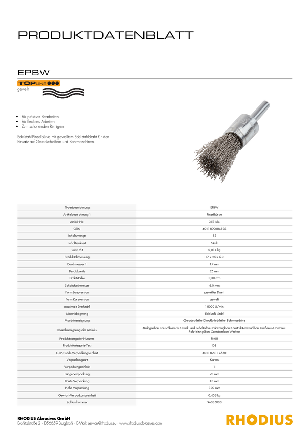 RHODIUS EPBW, 12 sztuk szczotka czołowa 17 x 25 x 6,0 mm, falista, TOPline, do stali nierdzewnej, stal Rhodius 353154