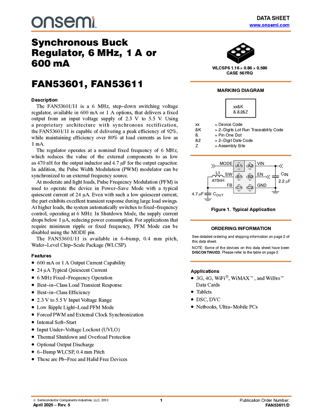 3 MHz, 600 mA / 1A Synchronous Buck Regulator