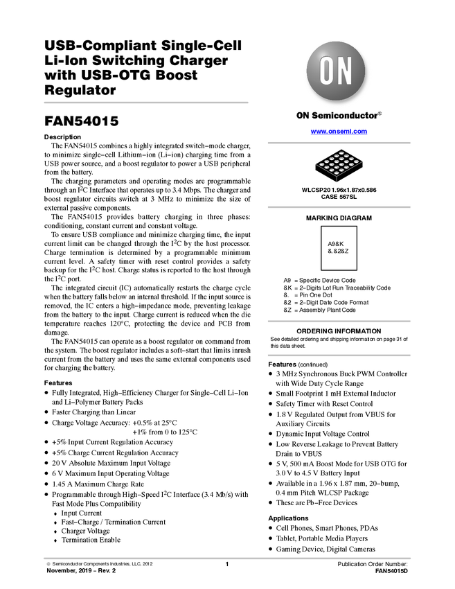 USB-Compliant Single Cell Li-Ion Switching Charger with USB-OTG Boost Regulator