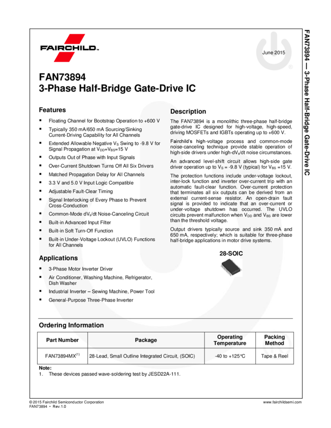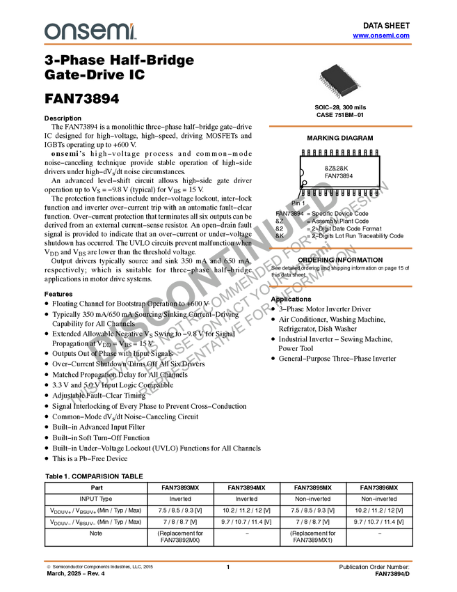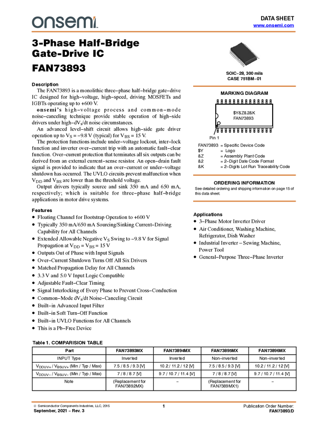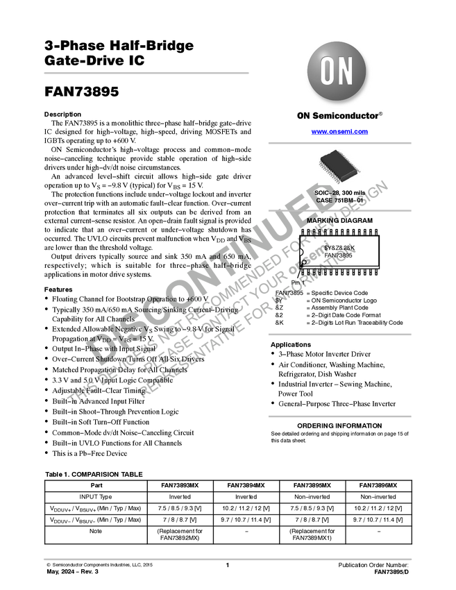 625V, 3.3/5V input logic compatible, 0.65/0.35A sink/source current, 3-Phase Half-Bridge Gate-Drive IC with OCP/Shutdown protection