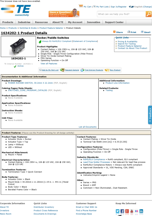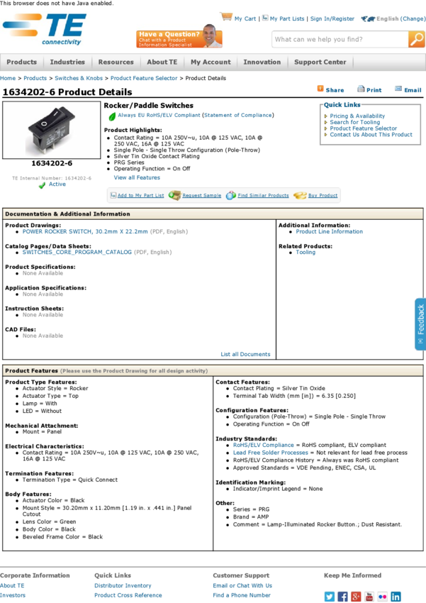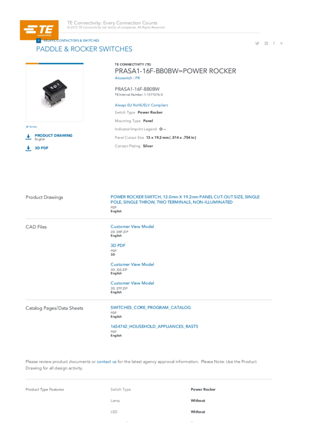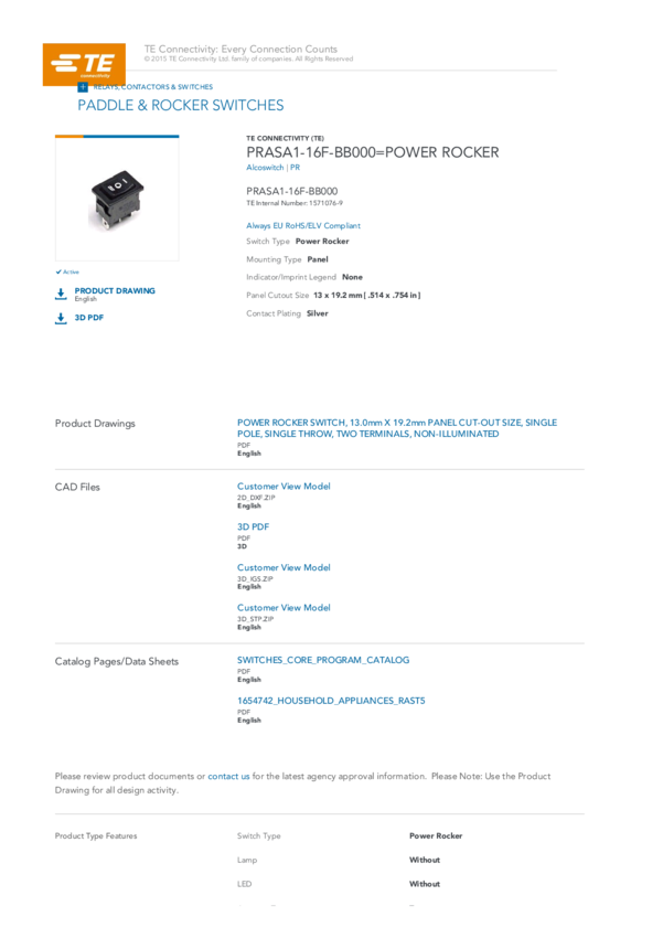 Switch Rocker ON OFF SPST Faston Rocker 16A 250VAC >100000Cycle