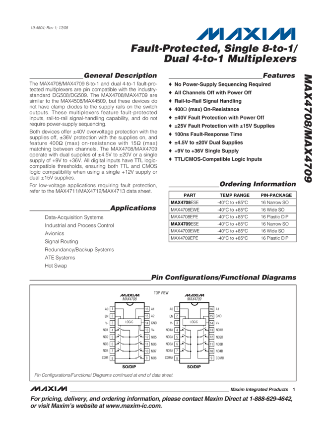 MAX4708, MAX4709 Fault-Protected, Single 8-to-1/Dual 4-to-1 Multiplexers