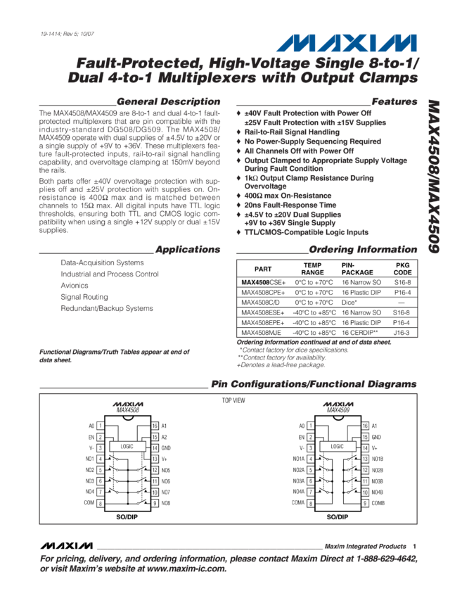 MAX4508, MAX4509 Fault-Protected, High-Voltage Single 8-to-1/Dual 4-to-1 Multiplexers with Output Clamps