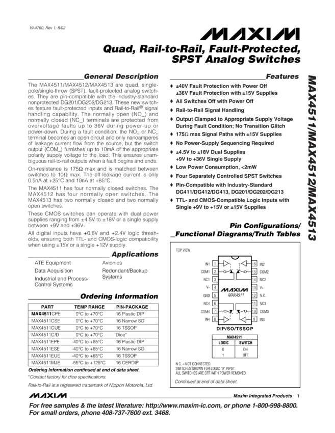 MAX4511, MAX4512, MAX4513 Quad, Rail-to-Rail, Fault-Protected, SPST Analog Switches