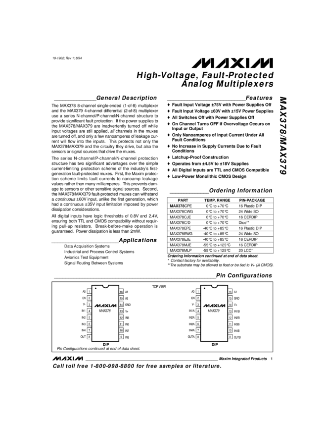 MAX378, MAX379 8-Channel, High-Voltage, Fault-Protected Multiplexers